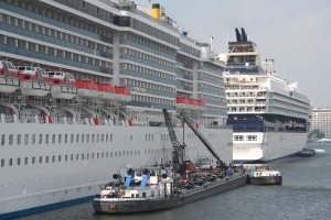 I live near the Passenger Terminal Amsterdam. During the ‘cruise season’ (march – october, but some cruiseships may arrive in november / december), there is usually a couple of cruiseships per week. Sometimes several arrive at the same time (I have seen as many as 5 at the terminal a couple of years ago). There is room for 2 really big ones (300 meters) or some small ones and sometimes they use the quay across the harbour at the Java-eiland if more arrive. Since the harbour is not 300 meters wide, the really big ships have to turn around at the other side of the Java-eiland.